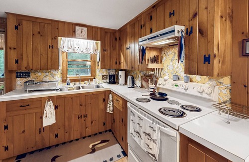 Inside the house, wood-paneled walls and large windows framing the lake create a cozy, inviting ambience. Settle in by the woodstove in the living room, play cards around the dining room table as dinner simmers in the kitchen, or even log onto the high-speed WiFi at the desk in the family room. Two comfortable bedrooms, a sleeping loft, and a private washer/dryer round out the interior.