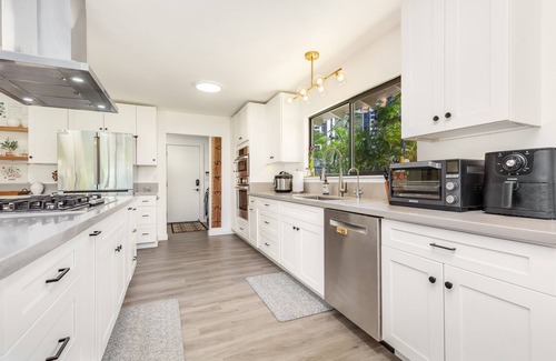 Nestled in an idyllic Hawaii Kai location, this exquisite island home provides a comprehensive array of amenities. Direct access to the marina and close proximity to Hawaii Kai Plaza as well as Hawaii Kai Town Center, this residence offers unparalleled convenience. Meticulously remodeled, the house boasts a master bedroom with a king bed, two guest bedrooms with queen beds, and a fourth bedroom ideal for remote workers, complete with a desk, monitor, and sofa bed for additional guests (there is also a comfortable queen size air mattress & pack and play available).