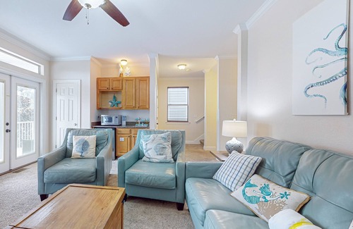 The home's three-story interior offers tasteful coastal decor and plenty of room to spread out. Features include two separate living spaces to kick back with some cable TV. You'll also find a handy wet bar/coffee nook along with a full, well-equipped kitchen. Additional perks include central air-conditioning and a private washer/dryer to keep you feeling your best.