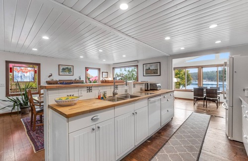 Inside, you'll be greeted by a bright, window-lined space that showcases its surroundings. The full kitchen features a French-door refrigerator, a gas range, a dishwasher, among other essentials, while an atmospheric wood stove warms the adjacent 10-seat dining table. Just beyond, the waterfront living room has an entire wall of windows framing Seabeck Bay - a wonderful place to read, watch movies at night, or simply gaze out at the view with a cup of coffee in hand. Peruse a collection of games, puzzles, and books, or grab the binoculars and watch for birds, deer, and seals.