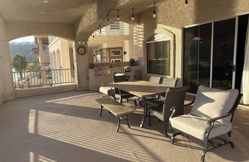 Welcome to our Beautiful Oasis. Waterfront villa right on the Colorado River with a private dock! Our five large bedrooms, five bath home sleeps 10-12 comfortably. Both decks make you feel like you're at a private resort with direct access to the river and views of the desert. The master is truly beautiful with a private terrace overlooking the water!