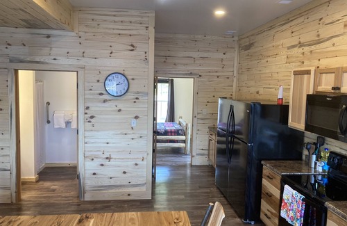 As you round the shoreline, the stretching waterfront landscape will catch your eye as you approach the parking lot directly in front of the lodge (Yes! There is ample space for a trailer!). You will use a keyless lock system to enter your cabin.