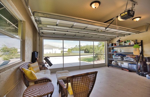 In the covered lanai area, you can expect to unwind, relax and get your vacation on with friends and family to the relaxing ambiance of bird sounds. There is plenty of seating throughout the entire home and the lanai is no exception. The fire table and Edison lights create a beautiful evening ambiance. Besides the pool you can find two comfortable sun loungers and a hammock. The saltwater pool is kept heated to a comfortable temperature year round.