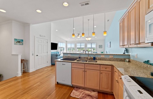 This home has coastal casual furnishing with 3 bedrooms, 4 full baths, elevator and 9ft ceilings that can easily accommodate up to 6 people. The floor plan is reversed with living room, kitchen, and guest bedroom with queen bed & full bath on third floor. Second floor has master bedroom with king size bed & full bath, guest bedroom with queen bed & full bath and laundry room. Ground level has a comfortable living area with large screen television, full bath and access to screened porch and deck. The full size kitchen has plenty of room for you and your guests. Features include granite counter tops, electric stove, refrigerator with ice maker, dishwasher, microwave, drip coffee maker and toaster.