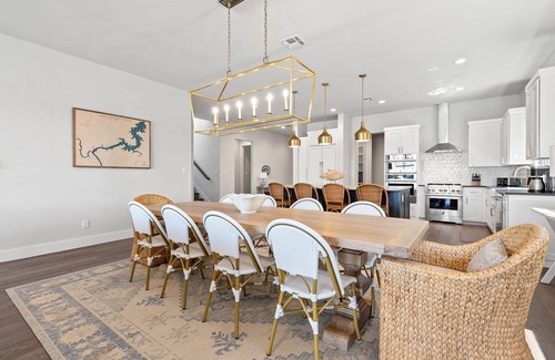 Elegant new lakefront home on Lake LBJ hosted by Waterhouse Rentals. All 6 bedrooms feature King Size Beds and there is an abundance of space to enjoy all that Lake LBJ has to offer. You can relax poolside in the infinity edge pool and hot tub (pool can be heated for additional fee) while enjoying amazing views. You can also head down to the boat dock and relax in the kid friendly depths of water that start as shallow as 2 feet and work up to 6 feet at the slides.