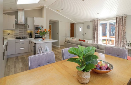 Waterside Lodge, a single-storey lodge, consists of an open-plan living space with a kitchen with a gas hob, electric oven, fridge/freezer, dishwasher, microwave, and wine cooler, a dining area with a dining table for six, and a sitting room with Smart TV and electric fire. The bedrooms consist of a king-size with an en-suite shower room, a twin, and a bunk, and there is a bathroom with bath, shower over, basin, and heated towel rail and WC. Outside, there is a decking with furniture and off-road parking for two cars. One well-behaved pet welcome. Sorry, no smoking. You can find a shop, pub and Lake Windermere on-site. Your journey to Cumbria is guaranteed to be one to remember, with a stay at Waterside Lodge. Note: There are steps up to the lodge. Note: On-site facilities include a shop, bar/restaurant, coffee shoe, entertainment venue, playground, arcade within 0.1 miles. mult-sports court, indoor pool, sauna/steam, spa bath, and launderette