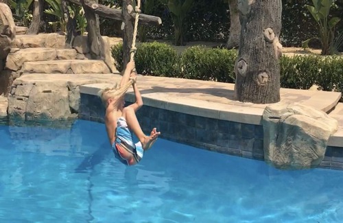 You will feel like you arrived in Paradise in this backyard!! Patio seating for the whole family, outdoor TV, fire pit, trampoline, basketball hoop, large driveway, built in BBQ with bar seating and a gorgeous pool with a rock slide and rope swing!