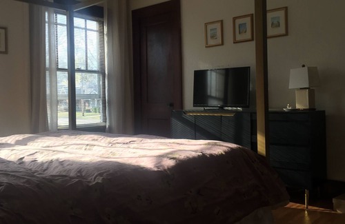 Highly sought-after historic location. Listen to the birds in the morning while you sit on the large front porch's porch swing, in the backyard under an umbrella, or by the fire pit. After a walk to the Saturday morning Farmer's Market, soak in the Jacuzzi tub and unwind. Beds sleep well and sheets are high count cotton.