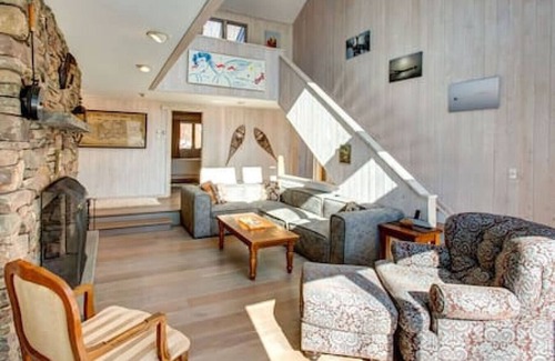 Up a flight of stairs is the master suite with two walk in closets, a wood burning fireplace, queen bed and en suite with shower and sauna. Sorry, the jacuzzi in the master en suite does not work!