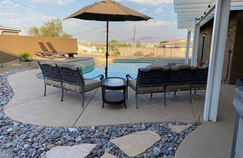At Casa Azul, you'll find Rest & Relaxation in the perfect northern location, 10 minutes to State Park boat launch. This newly remodeled 3 bed 2 bath home sits next to the Avalon wash and near the Mohave County OHV area. Refreshing pool and heated spa. Inside, you will find the furniture, appliances, smart TVs, are all in working order. We have all the necessities to make home-cooked meals. This home will provide comfort and convenience for up to 6 guests. 1,230 sf. No parties, no smoking inside, Dogs on approval, woof!