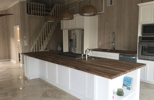 Chef’s kitchen boasting a large sink, an additional island prep sink, gas cooktop topped with plantation teak countertops. Fully equipped with stainless and nonstick cookware. Keurig and toaster are hidden away in appliance garage to the right of the sink, keeping the countertops clear. The island seats 6+, we often have 10 or more for family gatherings. Kitchen is an open concept to the living area. Also opening to an Eastern 14’ door to the deck as well as a 6’ door to the outdoor kitchen.