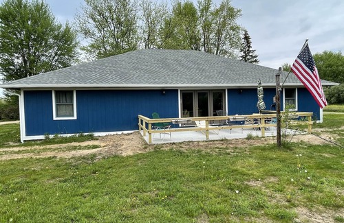 This wonderful wheelchair friendly home has just finished a one and a half year complete rehab. The property sits on 20 acres. The house has 4 large bedrooms, each with its own walk-in-closet. Two of the bedroom share a Jack-N-Jill bathroom and there is a second full bath as well. There are 2 bedrooms and 1 full bath on each side of the home. The 2 bedrooms to the East have a king size beds and the 2 bedrooms to the West have queen size beds. In between the bedrooms and bathrooms is large living area we call the Lodge Room, which has separate seating, dining and t.v. viewing areas, as well as 2 full/queen size hide-a-beds. All in all, the home will sleep 12. There are 5 flat screen t.v.s, 1 in the Lodge Room and 1 in each bedroom. Cable and Wifi service, as well as Google Home, is offered throughout the house. There is a 12'x28' deck located at the back of the house, and includes an outdoor shower. Also, there is a 12'x24' patio located at the front of the house off of the living room. The kitchen is quite large and has brand new hickory cabinets and brand new stainless steel appliances. During the warmer months we offer central air conditioning. During the colder months we have both radiant floor heating, as well as gas forced air heat; take your pick! There is also a utility room with a full sized stacked washer and dryer.