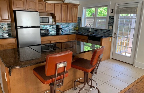 This quaint home includes a comfortable living room, a dining room that seats six, a well-equipped kitchen, and outdoor grilling area. The bedroom has its own en suite bathroom with walk-in shower. Additional sleeping is available on the fold-out sofa in the living room. The front porch, and side deck offer great outdoor space for enjoying coffee in the morning and cocktails in the evening. Fenced in front yard for the pups.