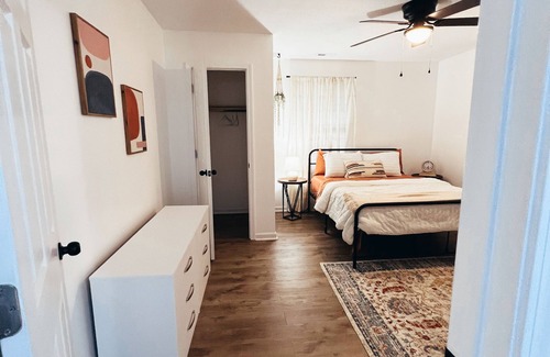 4 bedroom house with beautifully designed bedrooms. Inside you’ll find a beautiful, open concept entryway, kitchen, dining and living room space. The entryway welcomes you with a bold designated work space that also provides the perfect opportunity for a photo op with family and friends. The kitchen, equipped with modern stainless steel appliances, granite countertops, and all the essentials you could need- including coffee and tea- and is perfect for whipping up a delicious meal while spending quality time with friends and loved ones. We have a washer/dryer, full bathrooms, and a large backyard. As dog owners ourselves, we understand the need for a pet friendly vacation rental. The large fenced in backyard has lots of room to sniff but please pick up after your pup. Driveway parking is available, and we are minutes from all major shopping centers, downtown Fayetteville, and Ft. Bragg. This private home will not be shared with anyone other than those in your party so sit back and enjoy! A great retreat for solo travelers, couples, families, but please know we have a strict no party policy.