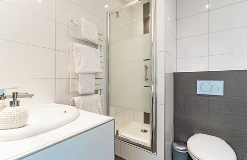 This charming apartment seamlessly blends comfort and style. The entry hall includes a convenient wardrobe. The spacious living room features a leather sofa, a flat-screen TV, and high-speed internet. Three large French windows lead to a private balcony, and the adjacent dining area seats four. The independent kitchen is fully equipped with modern appliances, including an oven, microwave, dishwasher, refrigerator, cooking plates, kettle, Nespresso machine, and toaster, along with all necessary cooking utensils. The bedroom boasts a 160 x 200 cm bed with a memory foam mattress topper and a cozy armchair. The bathroom includes a shower, sink, and hairdryer. Additional amenities are an iron, ironing board, and separate WC. This non-smoking apartment offers a tranquil and stylish retreat.