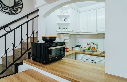 The bedroom area includes a double bed, elegant furniture, a television and air conditioning. In addition, the apartment has a dishwasher and washing machine, ensuring comfort during your stay.