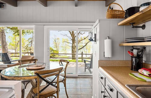 Part of Chimney Corners Resort on Crystal Lake! This apartment is located directly across M22 from the lake. All units at Chimney Corners include shared access to our 300+ feet of private beachfront. This apartment features a patio, a full kitchen, dining and living area with a gas fireplace, and one bedroom with two queen beds. Part of a two-unit duplex, there is a shared parking area and walkway. Sorry, no dogs allowed.