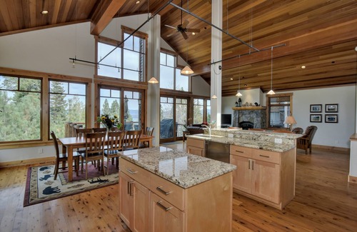 With vaulted ceilings and windows on all four walls, this spacious room comfortably seats everyone for drinks, movies, games, or relaxation time by the fireplace after a day on the slopes or at the beach. Leather furnishings, TV, high speed internet, gas fireplace with auto thermostat, and unbeatable views of Lake Tahoe. Main deck off living area is comfortably furnished with patio furniture and gas barbecue (except during winter months). A great space to gather for a meal, or simply to relax and take in the view.