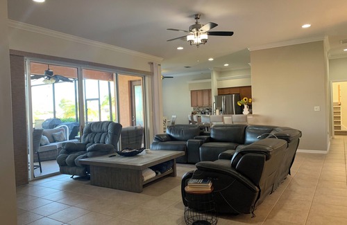 Paradise! Relax in this spacious 3-bedroom home conveniently located in Lehigh Acres, Ft. Myers area. This inviting home is perfect for a tranquil getaway that features a private pool with a lanai. Featuring 1 king bed, 2 queen beds, den, extra bonus family room 2nd floor with a queen bed chest. Make your vacation one for the books with a stay at our place! Beautiful sunsets facing the golf course right out the back door.