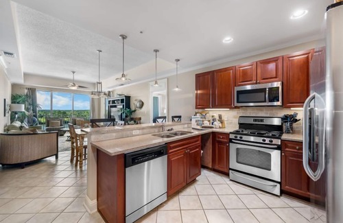 The primary bedroom has a king size bed and the guest bedroom has 2 queen beds. Both bedrooms are equipped with flat screen TV's and DVD players. Off the primary bedroom is a bathroom with large soaking tub and glass door walk in shower. The second bathroom also features a large glass door walk in shower. This unit includes a separate laundry area with a stackable washer and dryer.