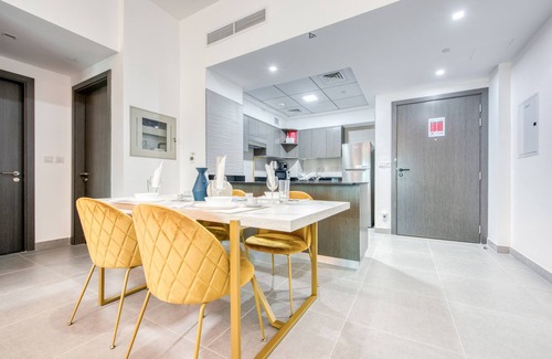 This holiday apartment offers a relaxing escape with well-designed spaces and eco-friendly appliances meeting your everyday needs. Al Barsha South has close proximity to business districts, leisure attractions, shopping malls, hospitals, and schools. Playful shades of yellow, pastels, and neutral tones are used throughout the whimsical home. With its tranquil setting and thoughtfully designed spaces, this vacation home will undoubtedly give you ultimate zen and relaxation.