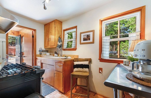 The Whimsical Cabin In The Woods is an alluring two story property that has been lovingly restored and redecorated by the homeowner. Cozy on up next to the wood burning stove underneath the wood vaulted ceilings and enjoy the calming atmosphere that only the mountains can provide. The cabin offers a fully stocked kitchen for all of your cooking needs, a beautiful second story principle bedroom with floor to ceiling windows, and a kid's room with a bunk bed and an additional pull-out trundle bed. The property has an additional suite with a day-bed and en suite half-bath located via separate entrance on the third story.