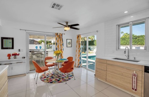 Our 3-bedroom home brings you the best of Palm Springs indoor/outdoor living. Stylish & comfortable, our home features floral accents and art walls to help you relax & unwind, along with modern amenities that make you feel at home. Enjoy the majestic, sweeping views of the San Jacinto mountains from our backyard, complete with heated pool, spa, dining area and Bocce Ball court. Our unique place is Instaworthy and has a style all its own. We hope you enjoy & make it your desert oasis!