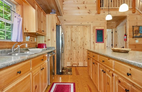 Whispering Trees Cabin, a Blue Ridge Log Cabin, offers all the amenities you wish for in your mountain getaway offering private backyard with Hot Tub, Firepit and babbling brook nearby.