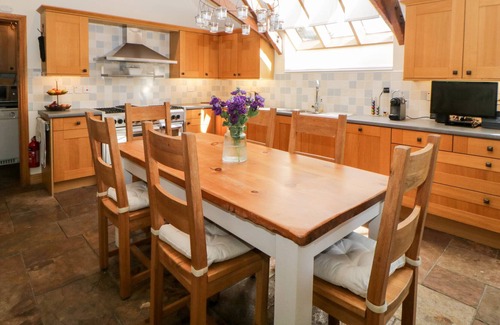 Amenities: Gas central heating. Electric oven, gas hob, microwave, fridge, fridge/freezer, washing machine, dishwasher and Nespresso coffee machine, WiFi. Fuel and power inc. in rent. Bed linen and towels inc. in rent. Stairgate available. Off-road parking for 3 cars. Enclosed lawn with multi-level terraces with furniture and views across the countryside. Two well-behaved dogs welcome, allowed on the first floor only please. Sorry, no smoking. Shop and pub 1.1 miles. Note: There are steps leading down to the terrace, please take care. Note: The washing machine, fridge/freezer and microwave are housed in the utility room. Note: Please bring your own beach towels. Please note: This property does not accept stag/hen or similar parties. Please Note : Property does not allow booking shorter than 7 nights between April and September