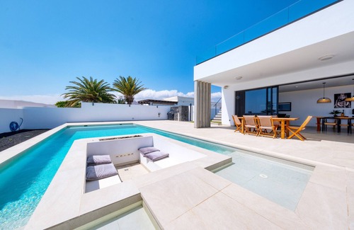Discover White House Villa, a contemporary design refuge located in Puerto Calero, one of the most sophisticated and exclusive enclaves in Lanzarote. A villa designed for those seeking a luxury experience, absolute privacy, and a unique connection with the island's natural environment.With a modern architecture and pure lines, this property has been designed to seduce from the first moment. Its interior spaces open to the exterior, integrating light, sea and nature in each room.Discover an elegant living room where comfort and style meet, and with centralised air conditioning for hot days. The comfortable sofas and chaise longues invite relaxation, while modern design details complete a relaxing and welcoming atmosphere. With a spacious living area open to the exterior, this space is bathed in natural light thanks to its sliding glass doors that perfectly connect with a private terrace and a spectacular pool.As a special detail, beneath the flat-screen television is an elegant artificial fireplace, perfect for adding a cosy touch on cooler nights or simply to style the ambience.The villa has four elegant double rooms with double beds and three full bathrooms with shower. One of them also features a bathtub with exterior views, where every detail has been carefully selected.The kitchen, fully equipped with everything necessary, conveys a relaxed luxury atmosphere, comfort and practicality, ideal for enjoying holidays without renouncing style and good taste. It is a space designed both for cooking and for socialising and sharing moments in a sophisticated environment.The heart of White House Villa is its spectacular outdoor area: an impressive solarium surrounds the heated swimming pool, whose uniqueness lies in the central bonfire creating a magical atmosphere as night falls. The chill out area completes this space designed for relaxation and enjoyment of the senses. The pool also has an automatic cover that guarantees the ideal temperature and greater safety.On the upper floor, a second solarium offers spectacular views of the sea, the island of Fuerteventura and the mountains of Lanzarote. This upper terrace becomes the perfect spot to contemplate the sunrise or bid farewell to the day with a drink at sunset, surrounded by natural beauty in all directions.For an even more complete experience, the villa is equipped with a surround sound system both inside and in the pool area, with Bluetooth connectivity to enjoy your favourite music at all times.Additionally, this spectacular Villa has an extra apartment on the ground floor. It consists of a living room with an American-style kitchen fully equipped with everything necessary, an extra bathroom and two bedrooms, thus increasing the villa's capacity to 12 people. The booking of this apartment is subject to an extra supplement.From any corner of the villa, one can contemplate one of the greatest privileges of this property: incomparable views of the horizon and dream-like sunsets, where the sky is dyed with warm colours over the Atlantic.Puerto Calero, with its exclusive marina, gourmet restaurants and select boutiques, is located just a few minutes away, offering the best of coastal life with the tranquillity of a reserved and sophisticated environment.White House Villa is not just a place to stay, it is a lifestyle. A modern oasis in Lanzarote designed for those who understand that luxury resides in the small great details.The swimming pool is heated and is included.Bed linen and pool towels included.