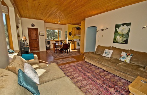 The two-story home is spacious and inviting, with two bedrooms—two upstairs (one king with additional queen futon and private luxury bathroom, one with a full day bed and private luxury bathroom, one half bath in downstairs main house.