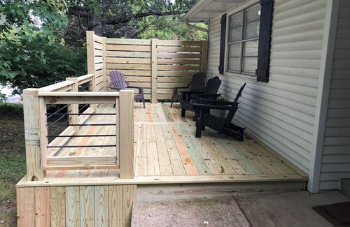 Small cozy place minutes to the town square and very close to lots of restaurants, coffee shops, shopping and grocery stores! There is one King Bed, and one Queen bed which would be very comfortable for 4 guests! Kick back and relax on the deck.