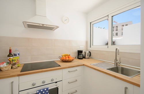 INCLUDED IN THE PRICE IS ACCESS TO THE FARIONES SPORTS CENTRE WITH HEATED SWIMMING POOL, GYM, SAUNA AND GUIDED ACTIVITIES.Stunning holiday home recently renovated just 200 metres from the beach. 2 bedrooms, 2 private terraces and access to the communal swimming pool and all services of the Fariones sports centre, located just in front of the accommodation. Perfect for couples or small families.White Volcano is ideally located in the centre of Puerto del Carmen, with all services (supermarkets, bars, beach bars, pharmacies, banks and shops) and the beach just a few metres from the apartment. Its location is ideal for enjoying a holiday with all the conveniences without the need for a car.This modern and charming ground floor property of 50m² is decorated with an exclusive design. It features a living-dining room, kitchen, two bedrooms, a bathroom with shower and two terraces.The beautiful living room offers a comfortable sofa, air conditioning and heat pump, Smart TV with satellite channels and free high-speed Internet with 600MB Fiber Optic. Additionally, it has a dining area with a spacious wooden table and chairs.The kitchen is fully equipped with ceramic hob, oven, microwave, coffee maker, kettle and electric juicer, refrigerator and a complete set of kitchenware. White Volcano also offers a bathroom with shower and 2 beautiful bedrooms: the main bedroom has a large double bed and the second bedroom has single beds.The outdoor area has two sunny terraces, one at the back - with a chill out area to relax and direct access to the living room - and another at the main entrance, where the washing machine is located. Free street parking is available.It is very important to mention that just in front of the property, only 10 metres away, is the Fariones Sports Centre, a large space with gardens and facilities such as a gym, swimming pool for adults and children, various tennis and padel courts, and an outdoor crossfit area. In the apartment, you will find a numbered card that provides unlimited access to said centre for all registered occupants.All facilities can be used free of charge, except for the tennis court, which must be booked and paid directly at the sports centre. Likewise, you can attend all the guided classes taught at the centre.The swimming pool is heated throughout the year at a temperature of 26ºC. The centre's hours are Monday to Friday from 7am to 10pm and Saturday and Sunday from 8am to 3pm.