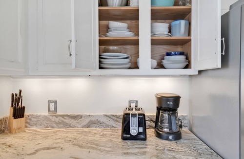 The gourmet kitchen has granite counter tops, stainless steel appliances and is ready to accommodate large families or groups. There is a bar height counter that seats 4, and the dining room table seats 6. Additional chairs available for porch side dining ! The dining room has proven to be a great place to gather to play board games, cards or just sit around the table and talk.