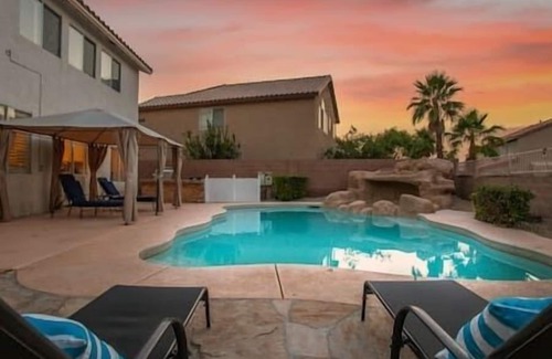 Are you looking for the ideal home for your group? Our chic oasis is waiting for you! Our 3000sqft property, located just outside of Las Vegas in the Henderson region, is ideal for large groups. Enjoy our gorgeous pool, patio furniture, and BBQ grill in your own backyard, or take a short drive to the Strip in less than 15 miles. This property includes a pool table, multiple 70 inch+ TVs with access to all major streaming sites, and plenty of other entertainment options!