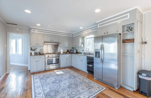 When entering the home, you are welcomed by the living room and the first wing of the house which has 4 bedrooms. 2 bedrooms have queen beds, 1 has a full/twin bunk bed, and the master bedroom has a king! The living room sofa is a couch bed! There are smart TV's in 3 out of the 4 bedrooms in this home along with a large smart TV in the living room. Go past the living room game table and past the half bath and you arrive at the open concept kitchen, dining room, and sunroom! The airy dining room is filled with large windows showcasing views and there is a large dining room table which provides seating for 8! Take in the gorgeous mountain views from the spacious front deck right off the kitchen to enjoy throughout the day as well as a sunroom in the front with vast brand new windows and sliding glass doors.The fully stocked kitchen includes dishes, plate-ware, cookware, and every utensil you will need to cook during your stay. Please take note below in the "Important things to know section about the Ice machine and Oven".