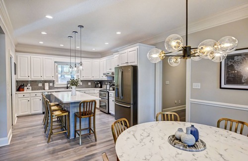 The main level features a bright and spacious living area with a plush leather sofa, stylish seating, and a large TV—the perfect place to unwind after a day on the water. The kitchen is fully stocked for everything from pancake breakfasts to holiday dinners, complete with a Keurig and drip coffee maker, generous counter space, and bar seating for four. A large farmhouse dining table offers seating for eight, while a cozy round table in the breakfast nook provides the perfect spot for casual bites and morning chats.
