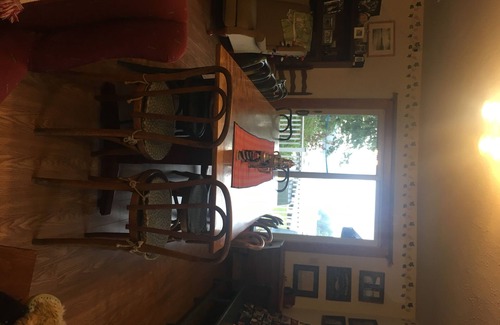 You enter the house into a large living room with a view of the lake and lighthouse. The large table is suitable for meals and games. There is a gas fireplace that creates a cozy atmosphere and heats the room.