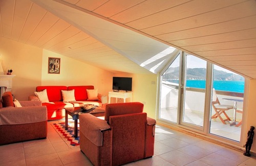 All our apartments have a sea view.The beach is only 60 metres away, there is a sunbed and umberellas for the use of our guests and it is free of charge during the summer.Should you like to swim in a cool seimming pool then there is a swimming pool next to apartm nts which you can use during the summer free of charge