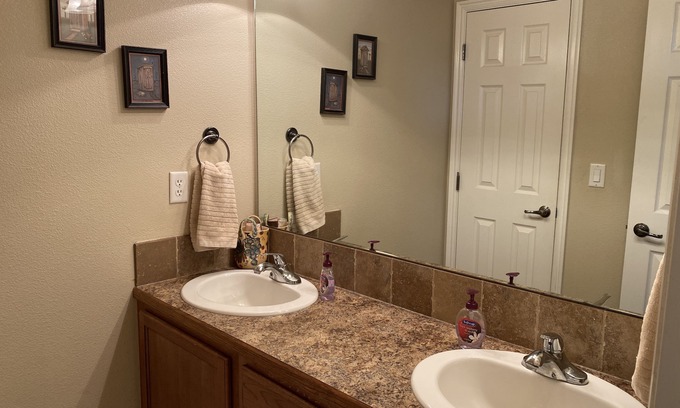 Master bedroom and bath on the main level, with 2 additional bedrooms and a bathroom upstairs. Home is fully equipped with everything you may need, including a pack-n-play for infants and plenty of fun for game nights in. One of the upstairs bedrooms has two sets of bunks and is equipped with a Nintendo Wii, making a fun and separate space for kids.