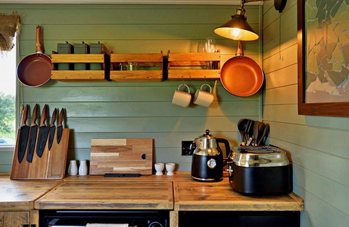The "Joan' Shepherds Hut" is a 2-room chalet with a total area of 30 square meters, suitable for accommodating up to 2 adults during their vacation. It features a living room with an open-hearth fireplace and one room containing a double bed.