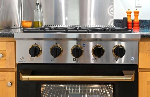 Unwind in the large living room, featuring a wall of windows overlooking the Redwoods, a cozy pellet stove, large flat-screen TV, and comfortable furnishings. The chef’s kitchen is perfect for preparing gourmet meals and entertaining your group.