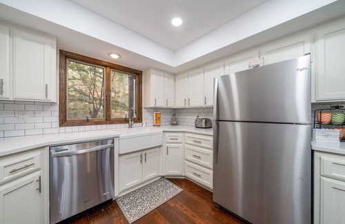 Luxury bath towels and bed linens are provided, along with essential items like dishwashing soap, laundry detergent, and toiletries. The home also offers covered decks, ceiling fans, and a beautiful, wooded view. Parking is available for two vehicles in the driveway.