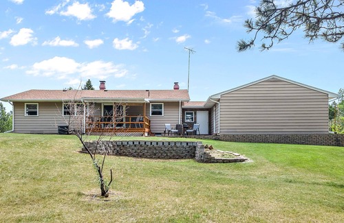 Enjoy this 2300 square foot, 4 bedroom, 2 bathroom home nestled in the quiet, serene Woodland Hills neighborhood, in Black Hawk. The home is located in the Black Hills on 2.5 acres and is decorated to celebrate the birds of the Black Hills. Bring your binoculars to watch the birds from the backyard and covered deck. Feed the deer and wild turkeys. A birdbath and birdfeeders encourage the birds to stop by. There’s a fireplace to use during the winter. Explore the large, wooded back yard. Two televisions (one Roku), a dart board and bird-themed games are available. This is the ideal place for eight people to make home base to explore all that the Black Hills has to offer. The home has an oversized 2 car garage, full kitchen, grill and washer/dryer. It is 15 minutes from downtown Rapid City, 20 minutes to Ellsworth, 25 minutes to Sturgis, 50 minutes to Terry Peak, 40 minutes to Deadwood, 45 minutes to Mt. Rushmore, 75 minutes to Hot Springs, one hour to the Badlands, 45 minutes to Spearfish and one hour to Hill City. There are National Forest access and hiking trails just minutes away.