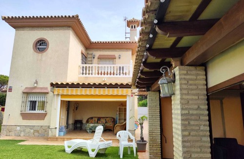 Two-storey villa in Chiclana with garden, porch with outdoor furniture, barbecue area. Capacity for 7 people.