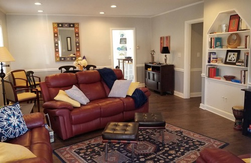 The yellow front door invites you in to find a comfortable space for your family and friends to enjoy during your stay in Middle Tennessee. The open concept living/dining room has comfortable reclining sofas and chairs, a dining area which seats six, dimmable recessed lights, and original hardwood floors. You will find an assortment of board games and playing cards in the built in cabinet!