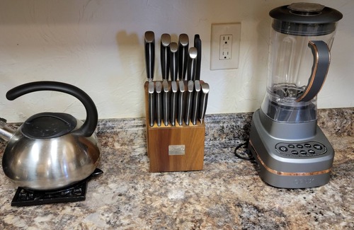 The home includes a full Kitchen with full-size appliances, and smaller cookware including Ninja coffee maker with pod options, rice cooker, and crockpot, numerous “gadgets,” and dinnerware and flatware with service for 12-14 people.