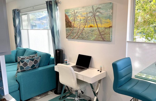 The state-of-the-art kitchen provides you with new stainless steel appliances, dishwasher, gas range, marble countertops, self-closing cupboards/drawers, pull out shelves, plenty of pantry space, garbage disposal, cool water dispenser in refrigerator, ice maker, OXO automatic drip coffee maker, Keurig and a fully loaded kitchen with all the dish-ware and utensils you would need. We even added the blender and waffle maker. Just head to the store and fill up the fridge with your favorites and you are set. Trader Joes, Vons and Ralphs are just a short drive away.