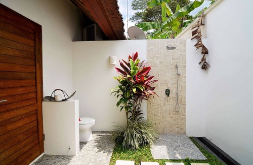A total of three air conditioned bedrooms are hosted within this villa - all of which have their own outdoor en-suite bathrooms and queen-sized four-posted beddings. Traditionally styled in contemporary Balinese aesthetics, the plush beds will ensure you a good night’s sleep. With its iconic thatched high-ceilings, the suites’ floor-to-ceiling sliding glass door open toward the rolling greens and glistening pool.