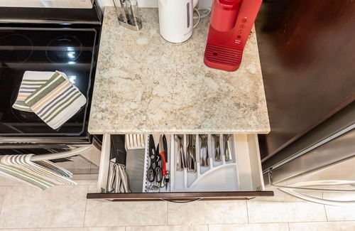The space includes an ensuite master bedroom and 2 bedrooms, with a TV in to enjoy movie nights in the living room. The kitchen is stocked for food-makers and lovers, including a BBQ grill on the patio for outdoor evenings. This retreat offers a work station and high speed Wi-Fi.
